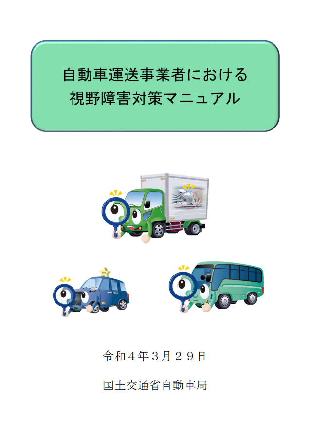今般、国土交通省において、自動車運送事業者が知っておくべき内容や取り組む際の手順等を具体的に示した「自動車運送事業者における視野障害対策マニュアル」が策定され、国土交通省自動車局長より通達が発出されました。