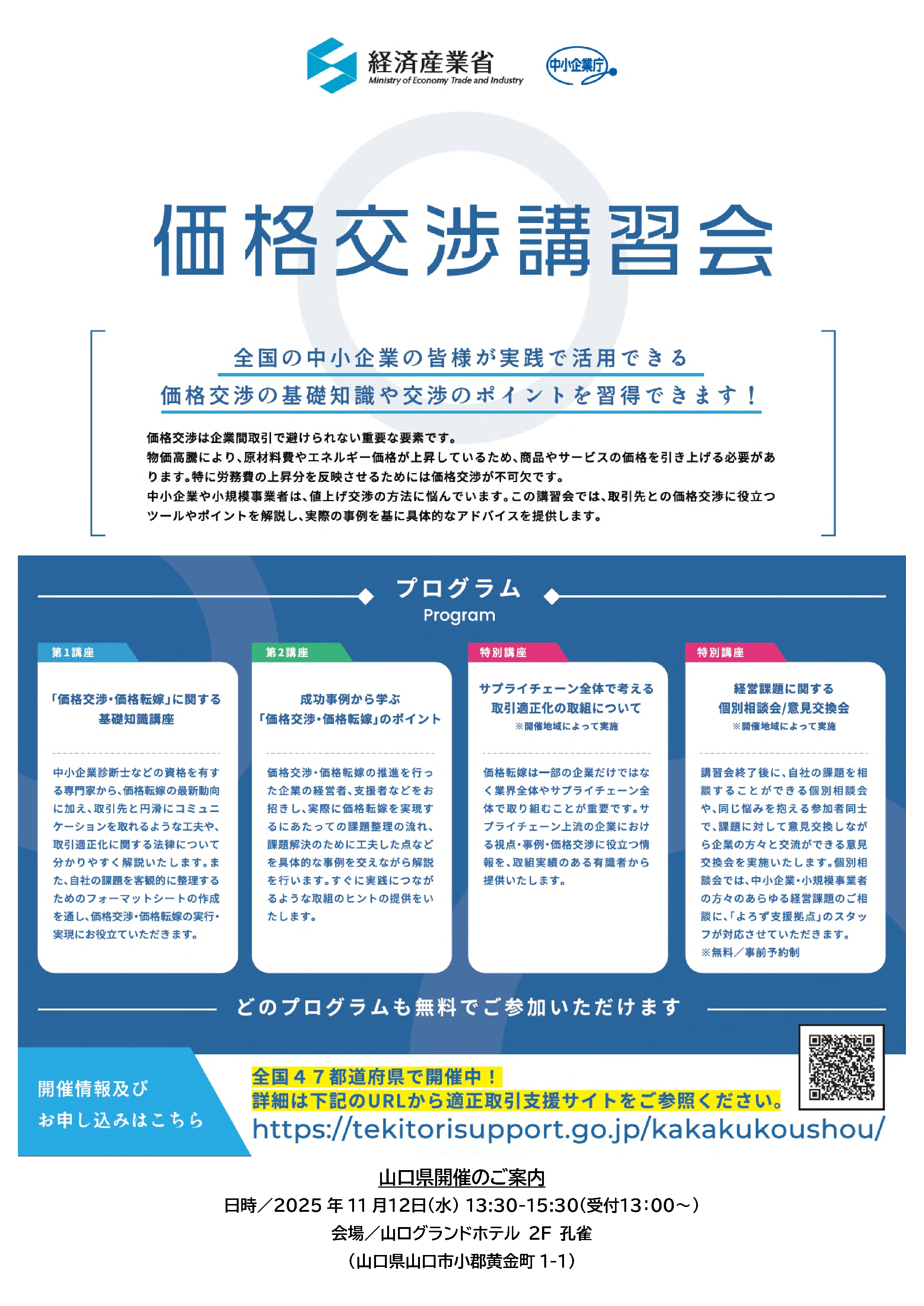 価格交渉講習会開催のお知らせ(山口県会場・オンライン)《経済産業省・中小企業庁》 2025年10月3日 総務 行政等からのお知らせ 価格交渉講習会のご案内_山口(PDF) オンライン開催チラシ(PDF)