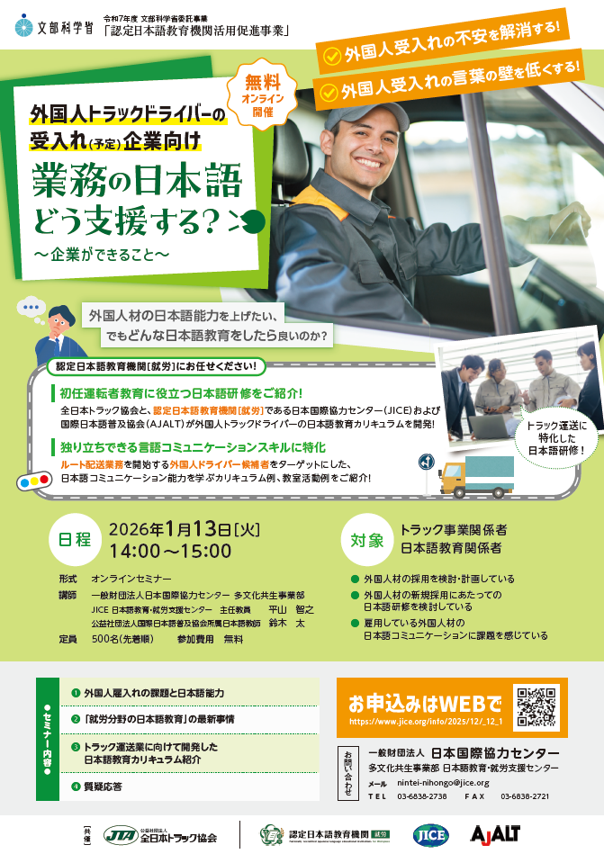 「外国人トラックドライバーの受入れ(予定)企業向け 業務の日本語どう支援する?」のご案内(2026年1月開催無料ウェビナー)《一般財団法人日本国際協力センター》